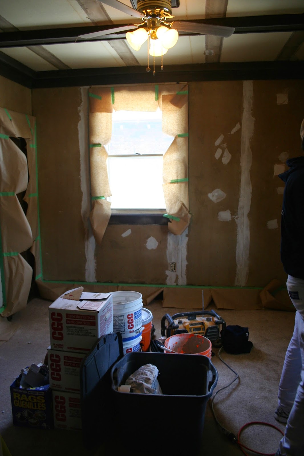 After removing all the wallpaper debris, sanding, vacuuming, and paper taping all our millwork (baseboards, and trim on windows and doors), we were ready for Jay and Eric to come in and work their magic. They set up shop yesterday, and went straight to work patching up all those cement board seams, as well as smoothing out rough patches and nicks in the wall.