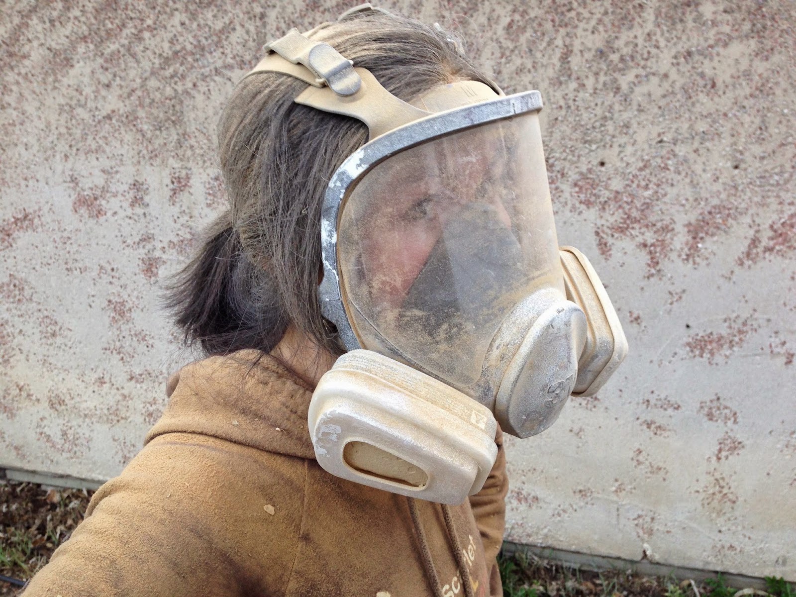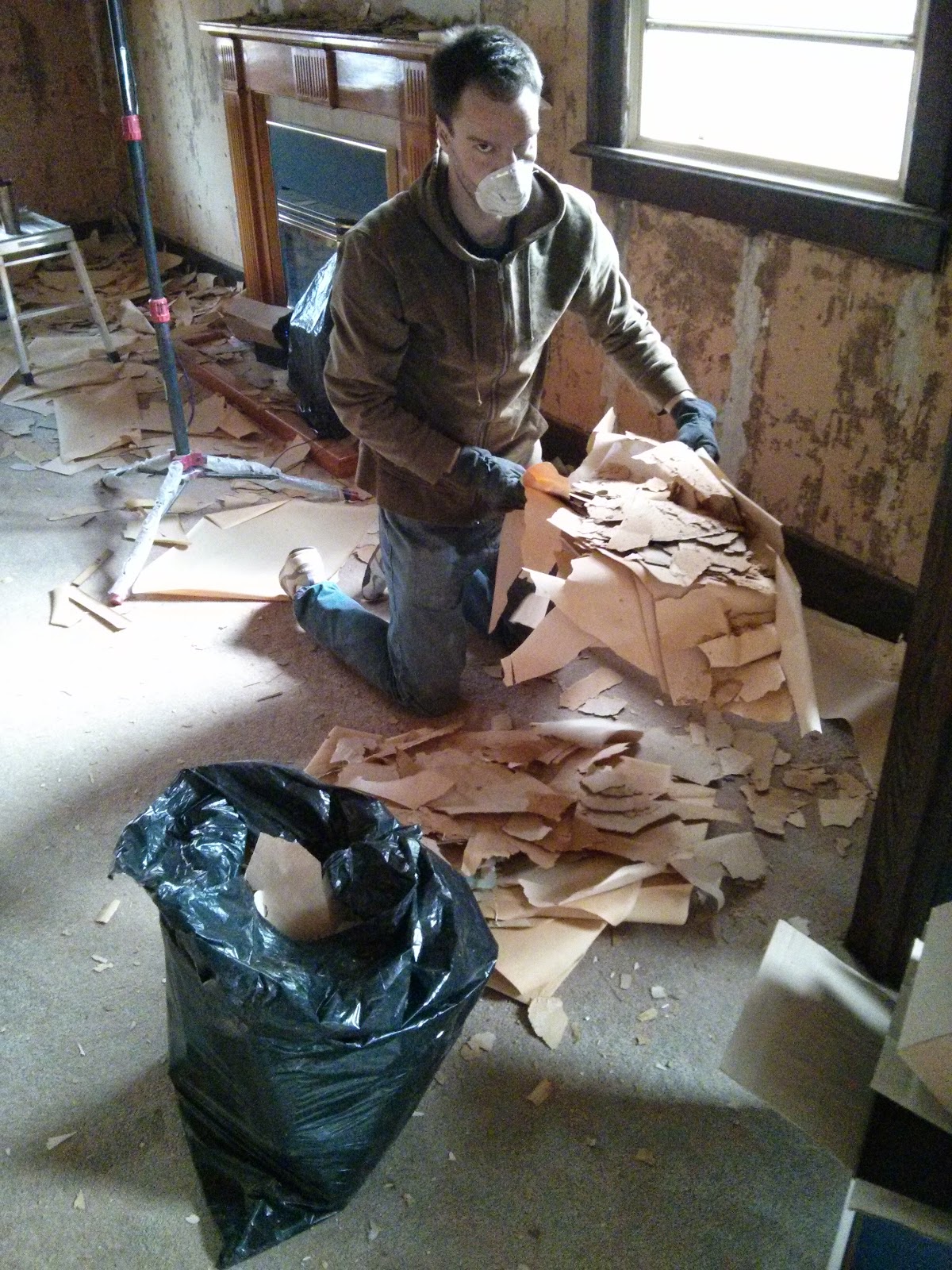 So we sealed off each room, donned respirator masks, and went at it. Let’s just say it’s punishing work. After 8 hours of sanding on Saturday, this was my final post-apocalyptic look: