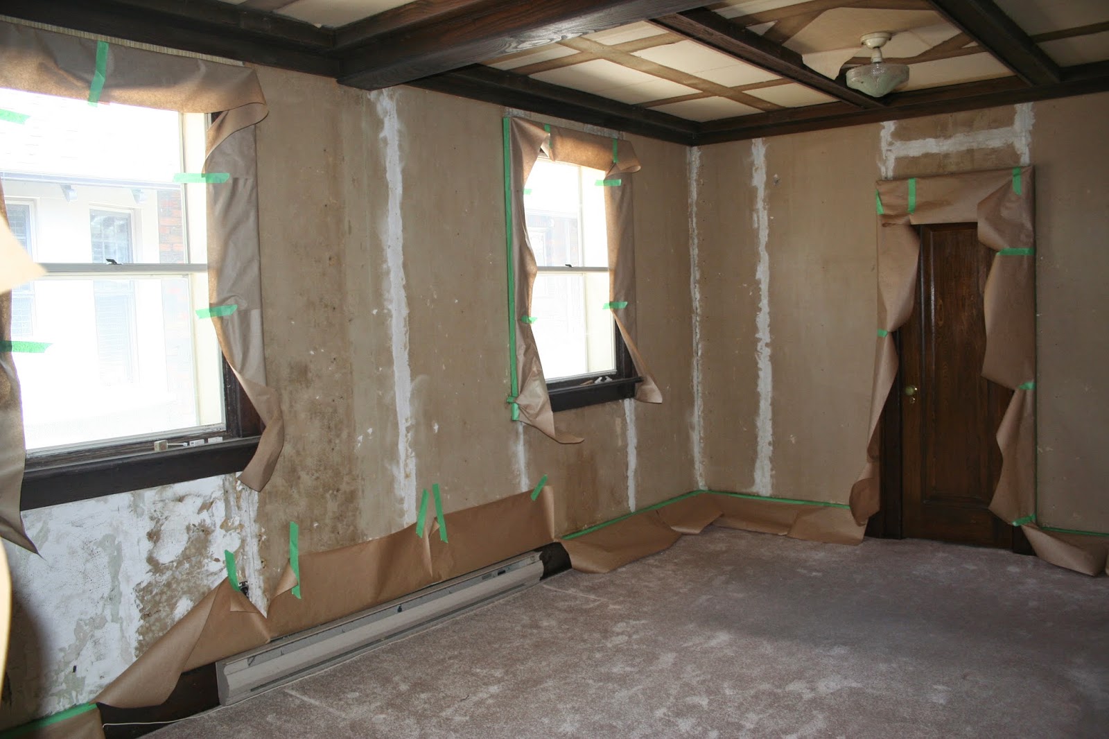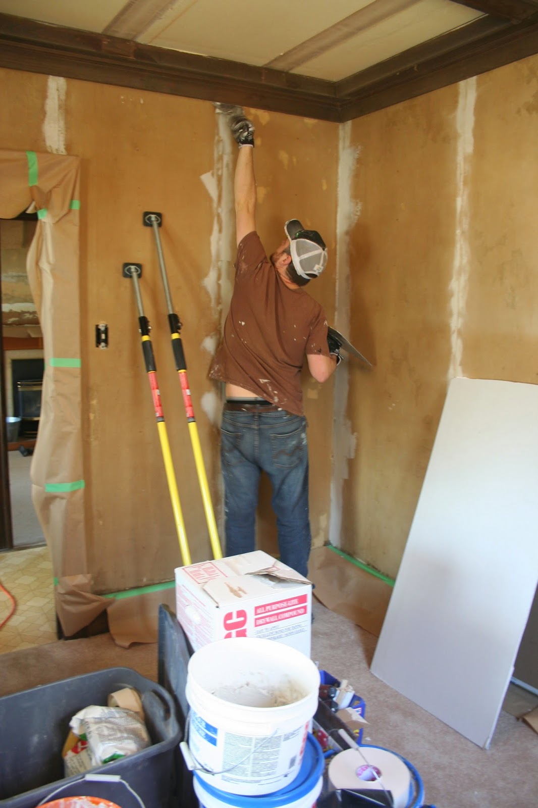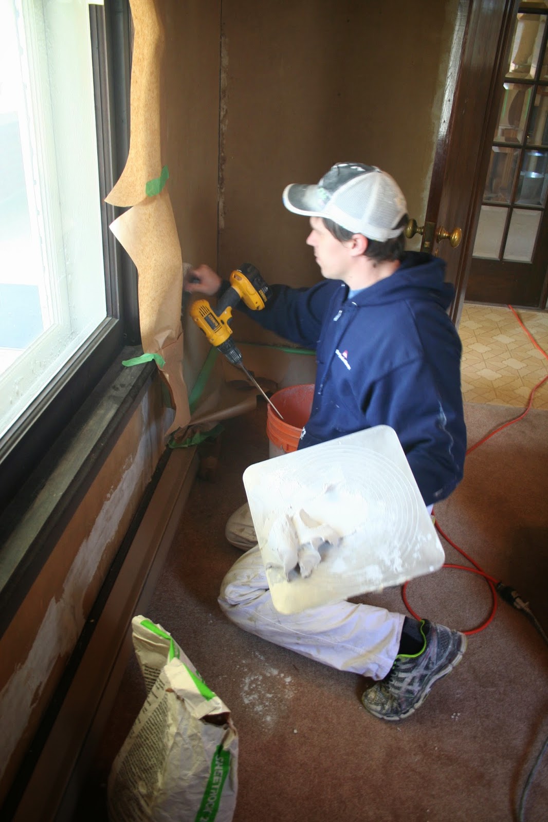 After removing all the wallpaper debris, sanding, vacuuming, and paper taping all our millwork (baseboards, and trim on windows and doors), we were ready for Jay and Eric to come in and work their magic. They set up shop yesterday, and went straight to work patching up all those cement board seams, as well as smoothing out rough patches and nicks in the wall.