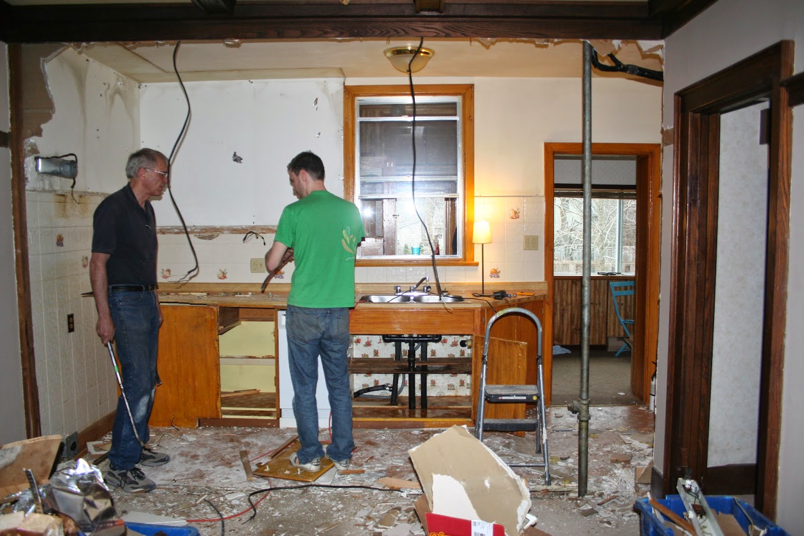 Jordan and Jim have also spent a ton of time this week working on the electrical outlets in the kitchen, moving the switches and plugs from the removed wall to places where we need and will use power in our new kitchen.